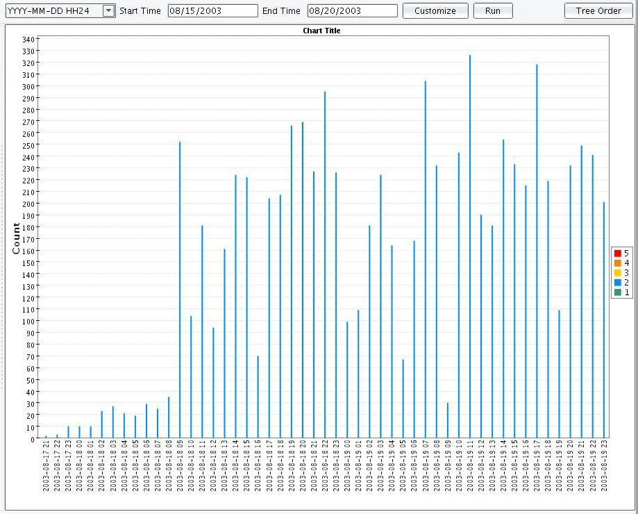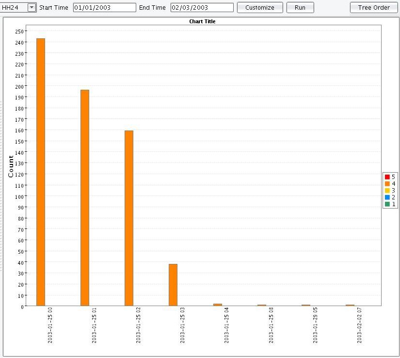 Rise and fall of the mighty Slammer in January 2003 (some fun research on Slammer propagation is here). This plot looks more like the "fall of Slammer", this is due to the fact that its rise was SO dramatic so it is only shown by one bar. Then, as congested networks went down and folks patched boxes or blocked outbound flooding, the rate went down. The worm exploits this vulnerability.